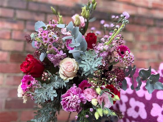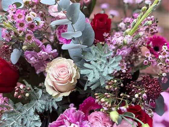 A pink and red themed bouquet of seasonal fresh flowers and greenery including red freedom roses.