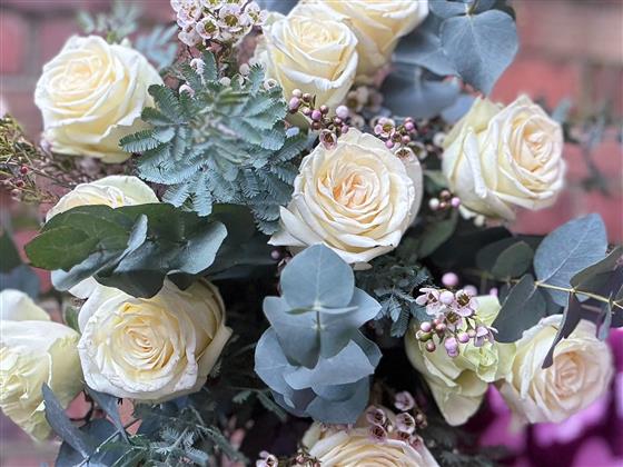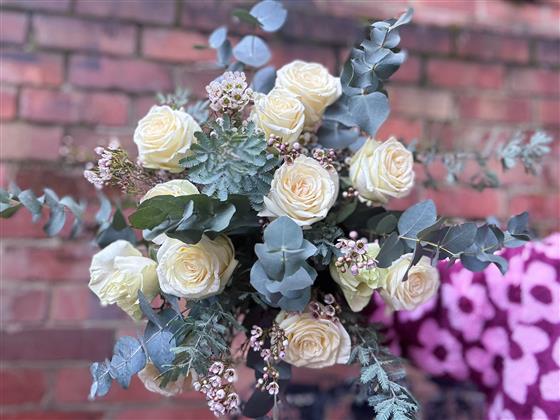 12 beautiful roses teamed with a complimenting 'filler' and eucalyptus.