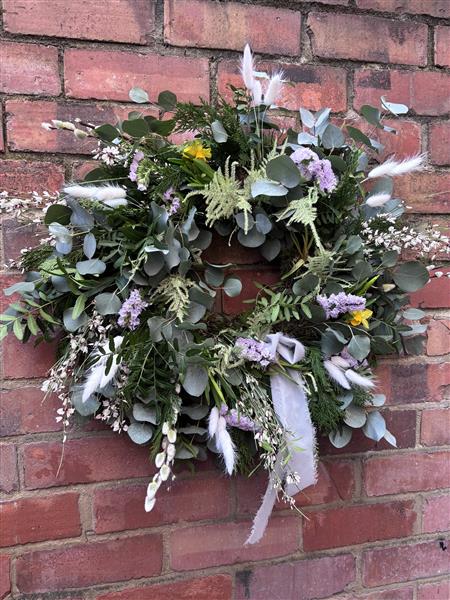 A fresh door wreath packed with lots of spring goodness in pastel shades of greens, lilacs and whites.